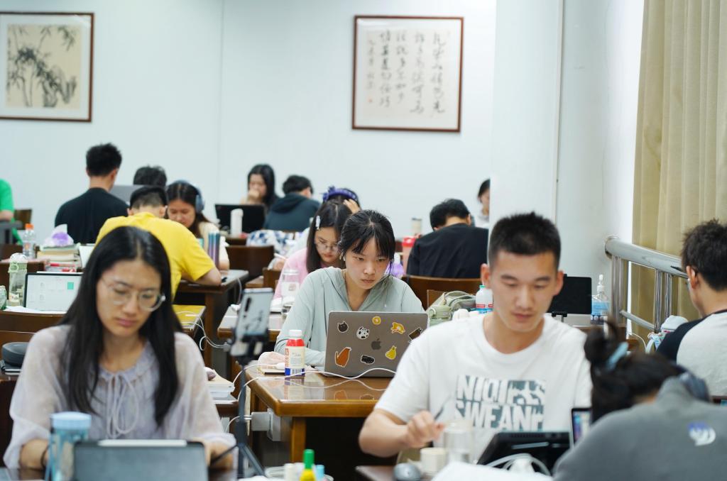 室外翻騰的熱浪,一如他們心中的信念和熱烈的青春,圖書館、自習室、寢室、樓道,處處都有他們認真備考的身影,同學們或是準備考研考公,埋頭于在繁雜的知識點中,向夢想一步步邁進;或是閱讀文獻,增加知識貯備,努力提升自我。日復一日的學習生活是單調的,但少年有夢,不止于心動,更是付諸行動。