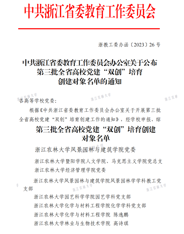 風(fēng)景園林與建筑學(xué)院黨委,經(jīng)濟管理學(xué)院黨委,暨陽學(xué)院人文學(xué)院、馬克思主義學(xué)院黨總支等3個黨組織入選全省黨建工作“標(biāo)桿院系”;化學(xué)與材料工程學(xué)院化學(xué)學(xué)科黨支部,風(fēng)景園林與建筑學(xué)院風(fēng)景園林學(xué)學(xué)科教工黨支部,園藝科學(xué)學(xué)院園藝學(xué)科黨支部等3個黨支部入選全省黨建工作“樣板支部”。林業(yè)與生物技術(shù)學(xué)院林學(xué)研究生第二黨支部高詩琪、化學(xué)與材料工程學(xué)院林業(yè)工程學(xué)科研究生黨支部陳逸鵬等2位學(xué)生黨員獲評全省高校“研究生黨員標(biāo)兵”。