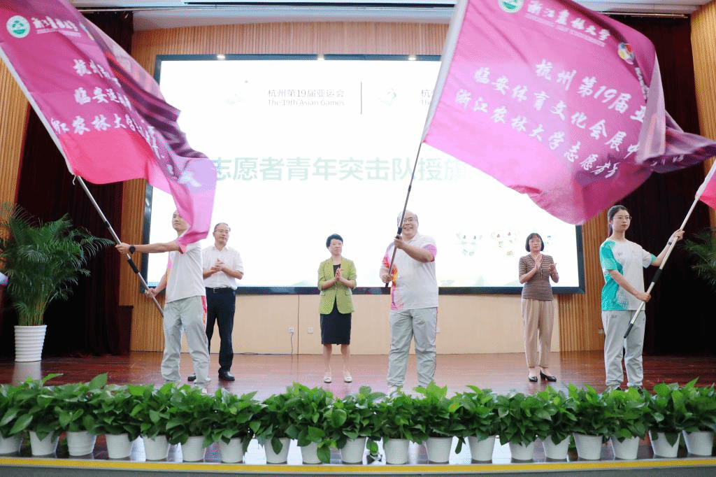 為全力沖刺亞運大考,在亞運志愿服務中不斷提升和彰顯“小青荷”的擔當力和貢獻度,我校成立了杭州亞運會臨安體育文化會展中心體育館浙江農林大學志愿者青年突擊隊,杭州亞運會臨安運動員接待飯店浙江農林大學志愿者青年突擊隊和杭州亞運會、亞殘運會火炬傳遞浙江農林大學志愿者青年突擊隊。施美紅、沈月琴、胡祖吉為青年突擊隊授旗。
