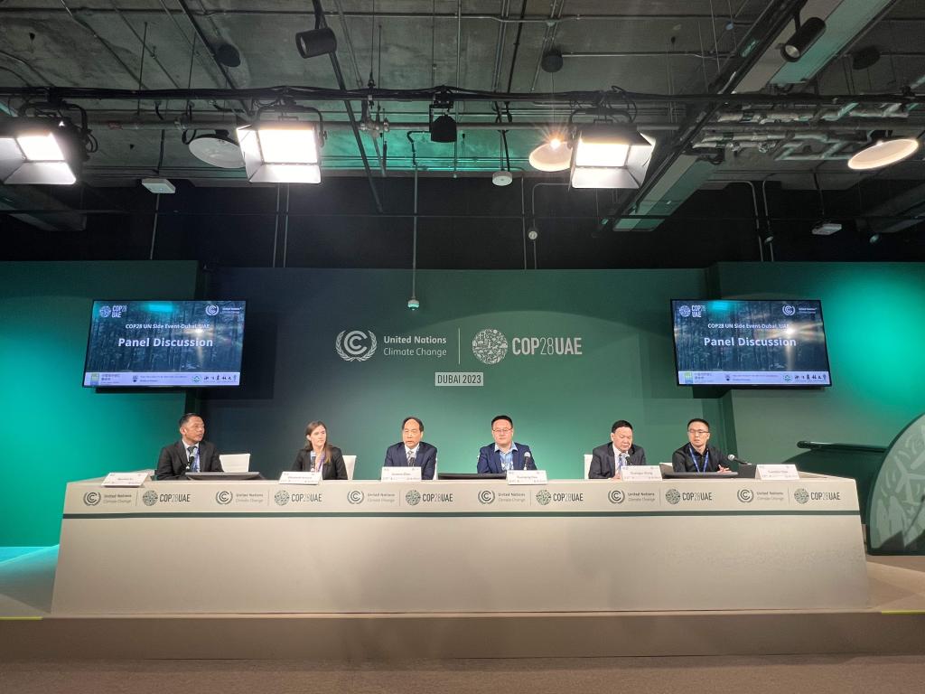 在聯合國氣候變化迪拜大會上,我校還和中國綠色碳匯基金會、加拿大UBC還聯合組織了“林業基于自然的氣候變化解決方案:知識與技能的全球對話”邊會,來自國內外的林業專家、企業家、政府官員等共同探討了林業緩解氣候變化的現狀和趨勢。周國模教授在會上進行了綠色創新案例分享,介紹了團隊在“以竹代塑”方面的研究成果和推廣成效。