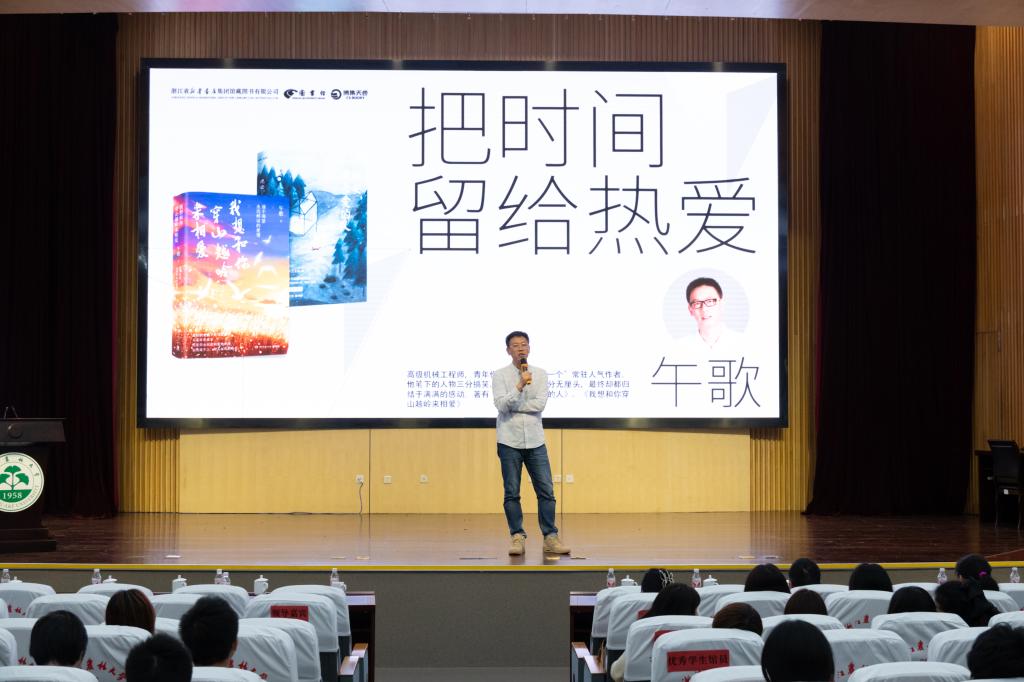 隨后,青年作家午歌作客書香農林之悅讀會,為師生帶來一場“把時間留給熱愛‘從機械工程師到暢銷書作家’”的分享會,分享了他獨特別樣的人生經歷、創作歷程和對閱讀的感悟。他真誠熱情的態度、風趣幽默的語言深深吸引著在場師生,其作品文字背后蘊含的是溫暖、執著和堅定的力量,給人以滿滿的正能量。