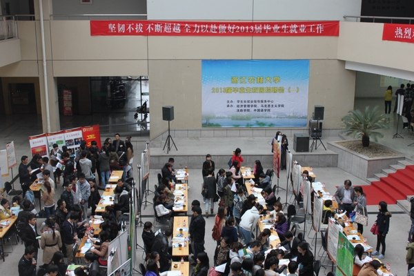 浙農林大新聞網訊 11月16日上午,由我校學生處就業指導服務中心主辦,經濟管理學院,馬克思主義學院、法政學院,外國語學院承辦的第一場2013屆畢業生校園招聘會在東湖校區活動中心舉行。參加本次招聘會的近百家企業提供了500余個工作崗位,吸引了眾多應屆畢業本科生、研究生前來應聘。