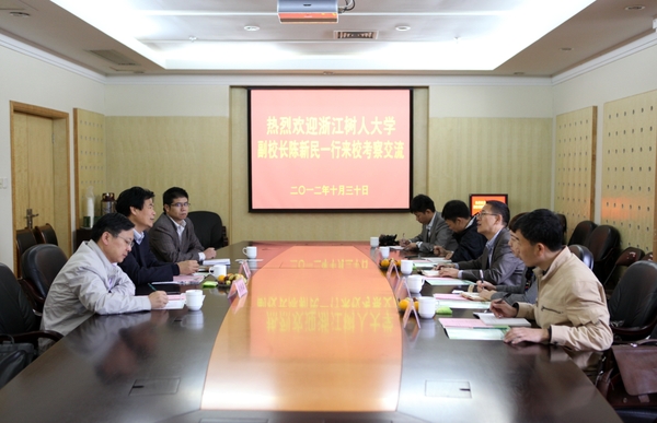 浙農林大新聞網訊 10月30日上午,浙江樹人大學副校長陳新民一行5人來校考察交流。我校副校長鮑濱福與客人們進行了座談,并向客人介紹了學校概況以及近年來的改革發展和建設情況。雙方主要就碩士點申報和科研工作情況等主題進行了深入探討和廣泛交流。