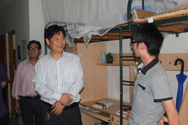 在商貿英語類學生寢室,鮑濱福與同學們親切交談,詳細詢問了他們的學習、生活狀況;在談及英語學習方法時,他結合自身的學習、科研經歷,向同學們強調了英語學習的重要性,指出學習英語要持之以恒,堅持不懈,還要和實踐活動結合起來,要學以致用。希望同學們能夠盡量豐富自己的課余生活,加強運動保持強健的身體,希望同學們明確目標,努力學習,積極營造良好寢室文化氛圍。