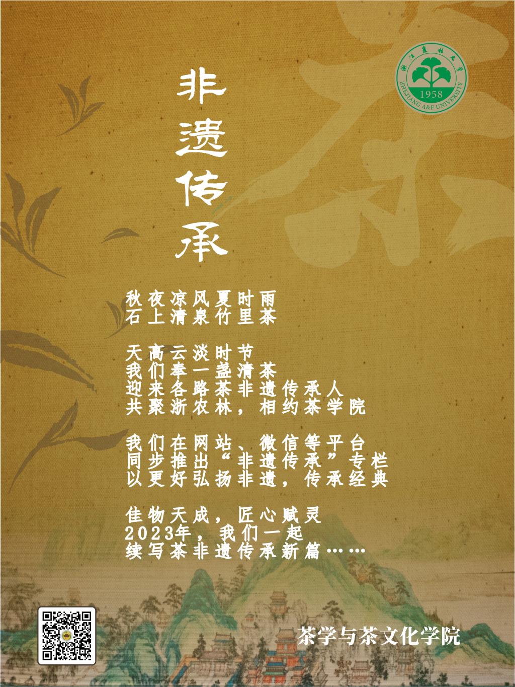 為貫徹落實由國家文化和旅游部、教育部、人力資源與社會保障部共同啟動的“中國非物質文化遺產傳承人研修培訓計劃”,進一步提高非遺項目持有者、從業者等傳承人群的傳承和實踐能力,提升“中國傳統制茶技藝及其相關習俗”項目的系統性保護水平,積極推進做好“茶申遺的后半篇文章”,浙江農林大學主辦的2023年“中國傳統制茶技藝及其相關習俗傳承人研修班”將于9月1日正式開班。