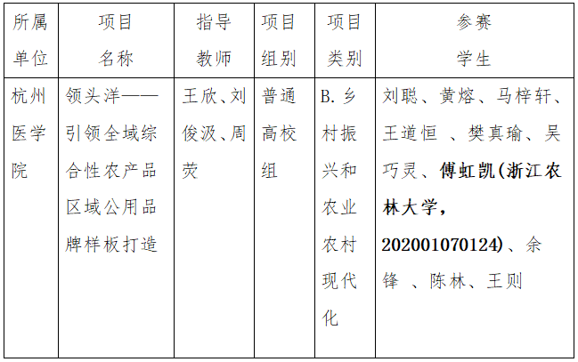 根據《關于舉辦浙江省第十四屆“挑戰杯”大學生創業計劃競賽的通知》相關要求,現將我校2020級園藝201班傅虹凱同學作為團隊成員參與《領頭洋——引領全域綜合性農產品區域公用品牌樣板打造》作品參加浙江省第十四屆“挑戰杯”大學生創業計劃競賽情況予以公示,具體如下: