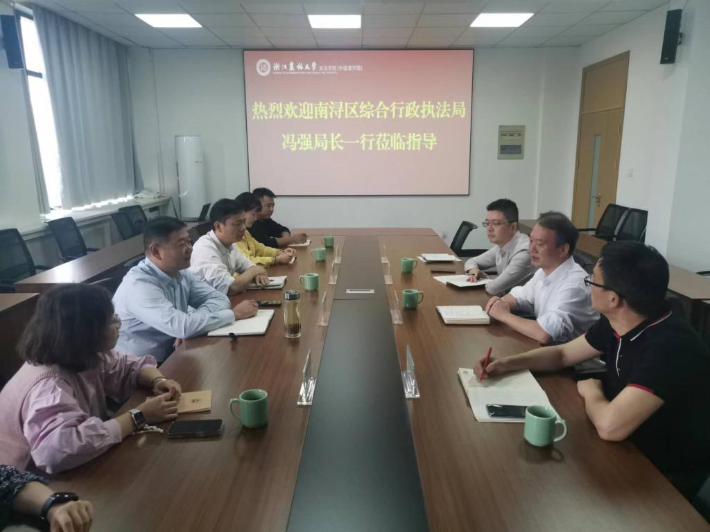 在65周年校慶之際,湖州市南潯區綜合行政執法局局長馮強帶隊,到文法學院座談交流。文法學院黨委書記朱紅東等學院相關負責人會見了馮強一行。