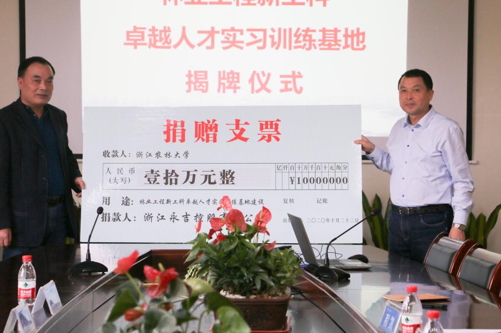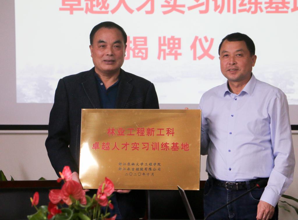 金春德和胡志慶代表院企雙方簽訂了《“黨建+產學研”院企戰略合作框架協議》,并共同為“林業工程新工科卓越人才實習訓練基地”揭牌。同時,學院聘請胡志慶董事長擔任客座教授,鄭華峰人力總監為職業規劃指導老師。永吉公司向學校教育基金會進行了首批公益捐贈,主要用于支持大學生實習實踐活動。